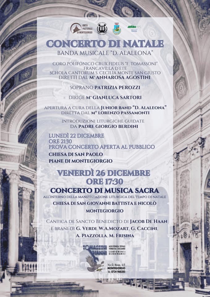 Venerdì 26 dicembre 2025 alle ore 17.30 presso la chiesa di San Giovanni Battista di Montegiorgio concerto di musica sacra. Ospite della serata la soprana Patrizia Perozzi Coro polifonico crux fidelis di Francavilla d'ete e coro Schola cantorum S. Cecilia di Monte San Giusto diretti da Annarosa Agostini